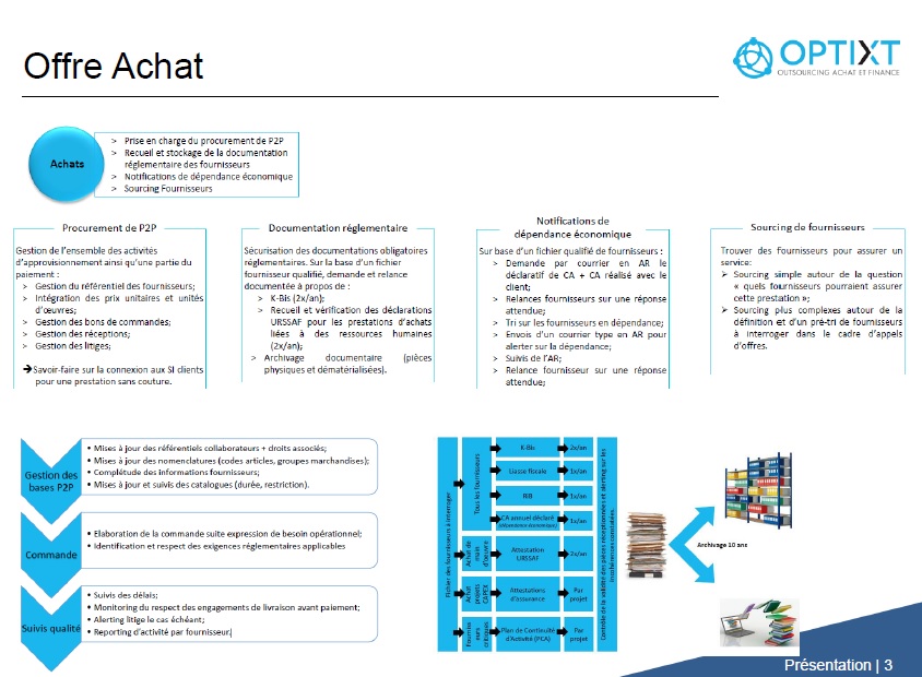 Aujourd’hui, avec une offre étoffée et une douzaine de salariés pour la partie approvisionnement, l’entreprise gère plus de 100 millions d’euros d’achat de sous-traitance IT ! David Métais,: « Nous sommes en mesure d’assurer l’externalisation de tout ou partie du processus achat et finance pour nos clients. Nous mettons à leur disposition les briques dont ils ont besoin et pouvons sourcer les fournisseurs, gérer l’intégralité de leur catalogue, leurs bons de commandes, les litiges éventuels…Tout ce qu’on appelle  le procurement P2P. » Mais l’expertise d’OptiXT s’étend aussi à la gestion des dépendances économiques des fournisseurs et à celle de la documentation réglementaire. Pour faire résumer OptiXT se charge de vérifier que les fournisseurs sont en parfaite conformité et gère l’archivage de la documentation. « Notre offre finance englobe quant à elle l’externalisation du processus de recouvrement amiable, la saisie des factures et leur dématérialisation, ainsi que la gestion des voyages et des notes de frais des collaborateurs de l’entreprise » Explique Pascal Merle.
